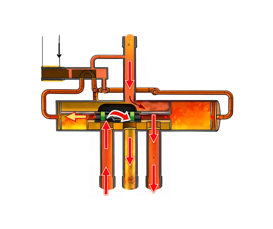 Das Ventil entscheidet, wohin das heiße Gas fließt.